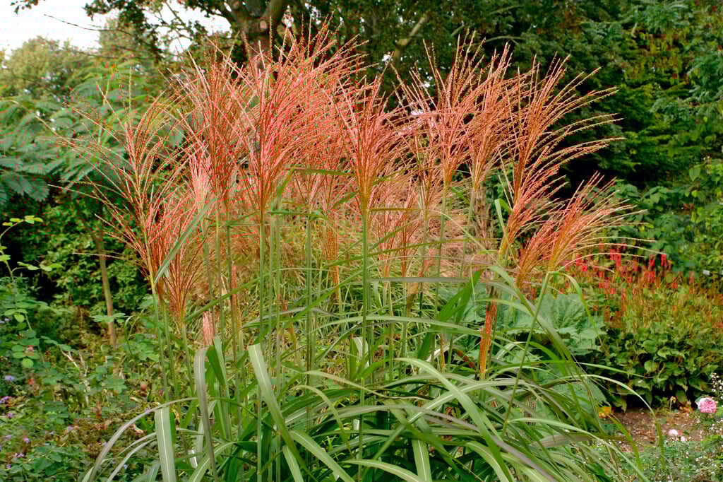 Miscanthus can be deciduous or evergreen grasses with tufted or spreading habit, erect stems bearing arching, linear leaves and terminal panicles of silky spikelets in late summer or autumn
