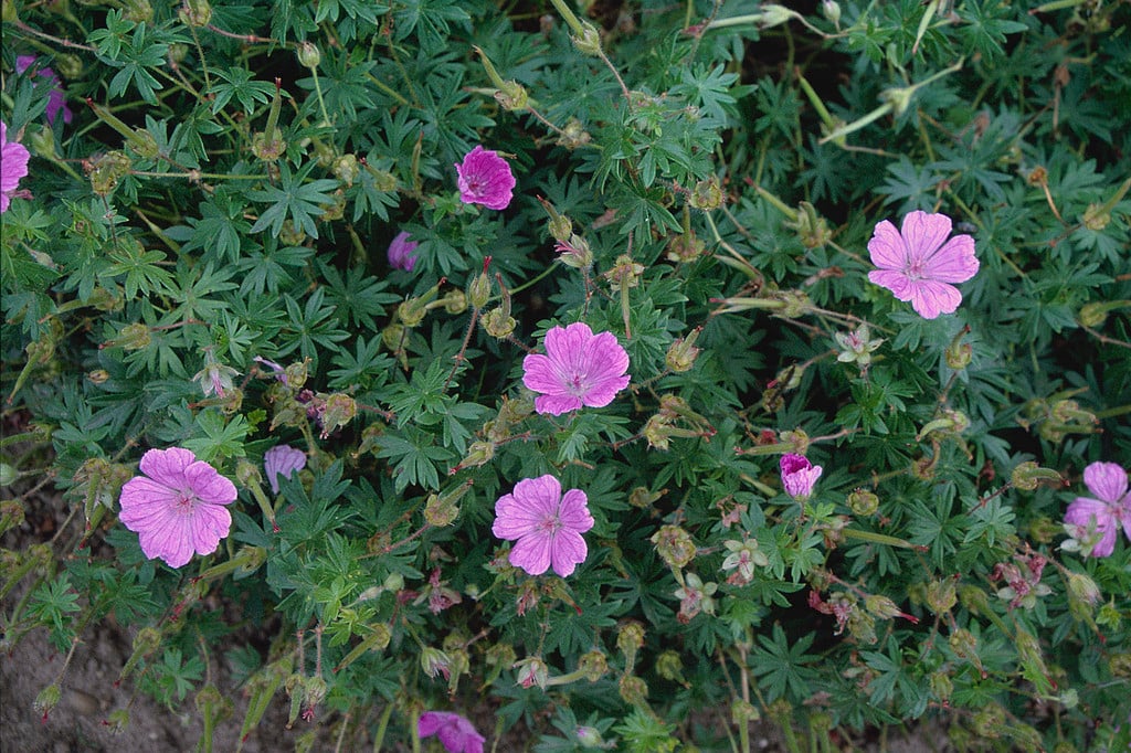 Geranium can be annuals, biennials and perennials, herbaceous or evergreen, with rounded, usually palmately lobed or divided leaves, and lax inflorescences of rounded, 5-petalled flowers