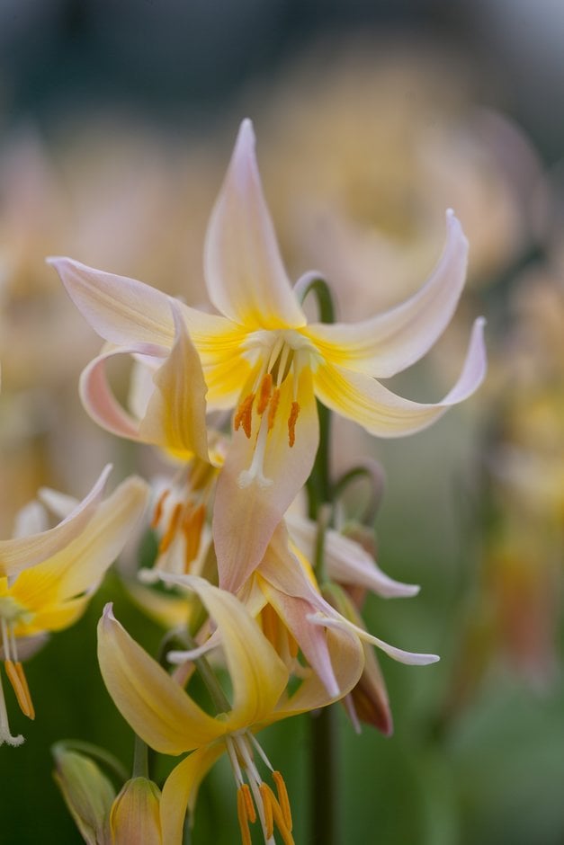 Erythronium are bulbous perennials with paired, ovate or broadly elliptic leaves, and leafless stems bearing one or more nodding, star-shaped flowers with recurved petals