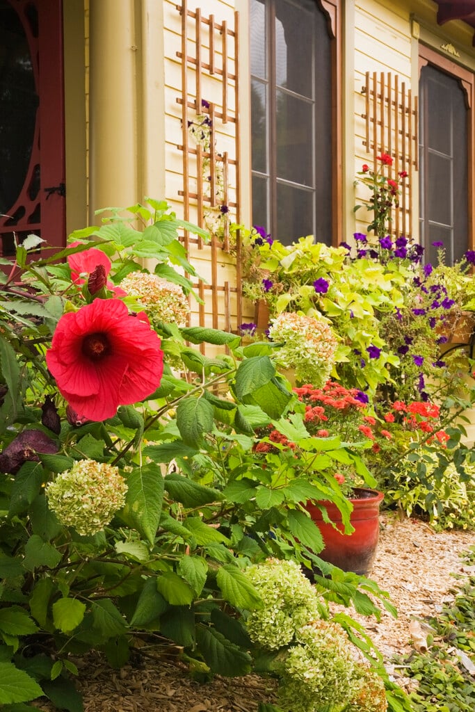 Hibiscus can be deciduous or evergreen shrubs, trees, annuals or perennials, with simple or palmately lobed leaves and large, funnel-shaped flowers over a long flowering season