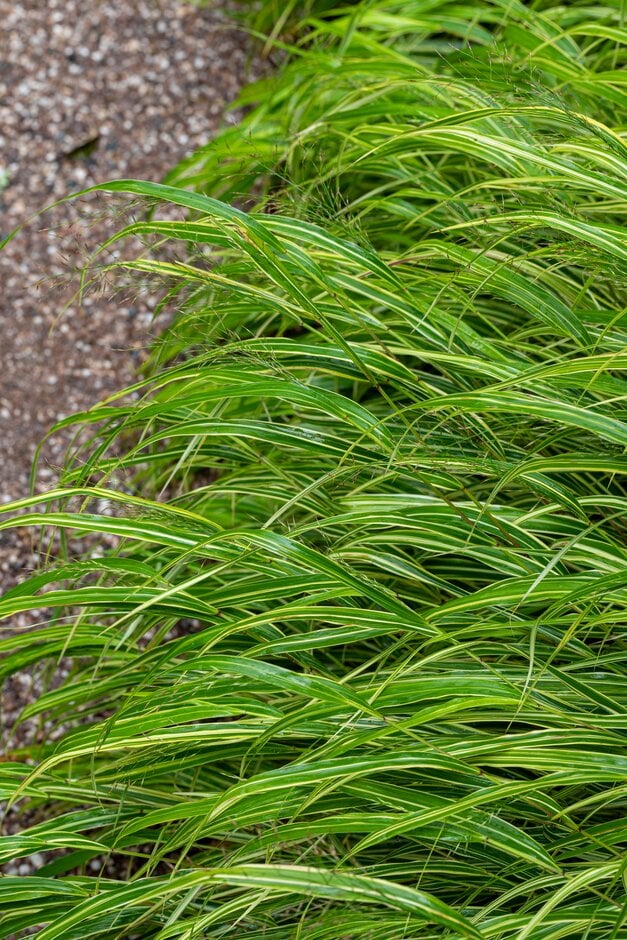 Hakonechloa is a deciduous perennial grass forming a compact tuft of arching stems bearing linear leaves, with arching flower panicles in late summer and autumn