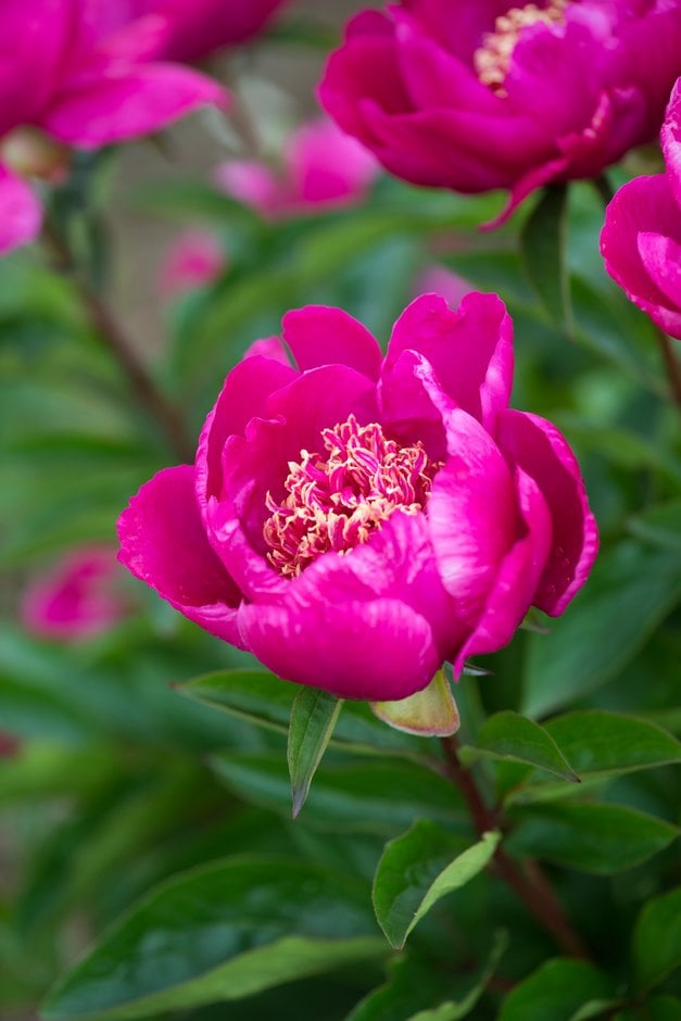 Paeonia may be herbaceous perennials or deciduous sub-shrubs with large, divided leaves and showy large bowl-shaped flowers, usually in early summer