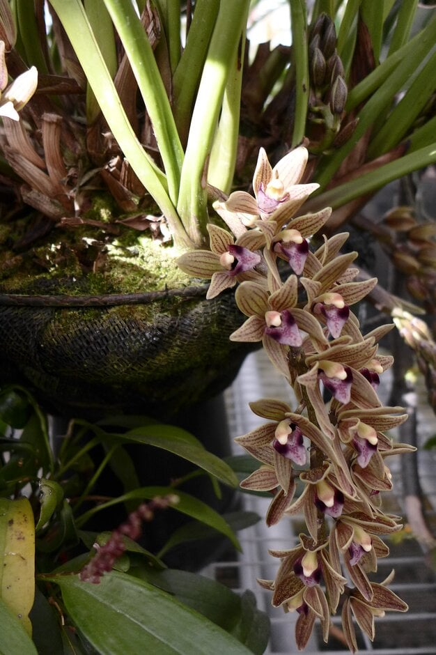 Grow in an open, free-draining orchid compost with addition of perlite, sphagnum moss or coir. Requires day temperatures around 16°C and 10°C at night. Provide good light levels, but avoid direct sunlight. Water plants thoroughly when compost is almost dry, allow to drain and use orchid fertiliser regularly during growing season. Reduce watering in winter. Place outside in dappled shade during the summer months to aid flower initiation. See cymbidium cultivation for more detailed information.