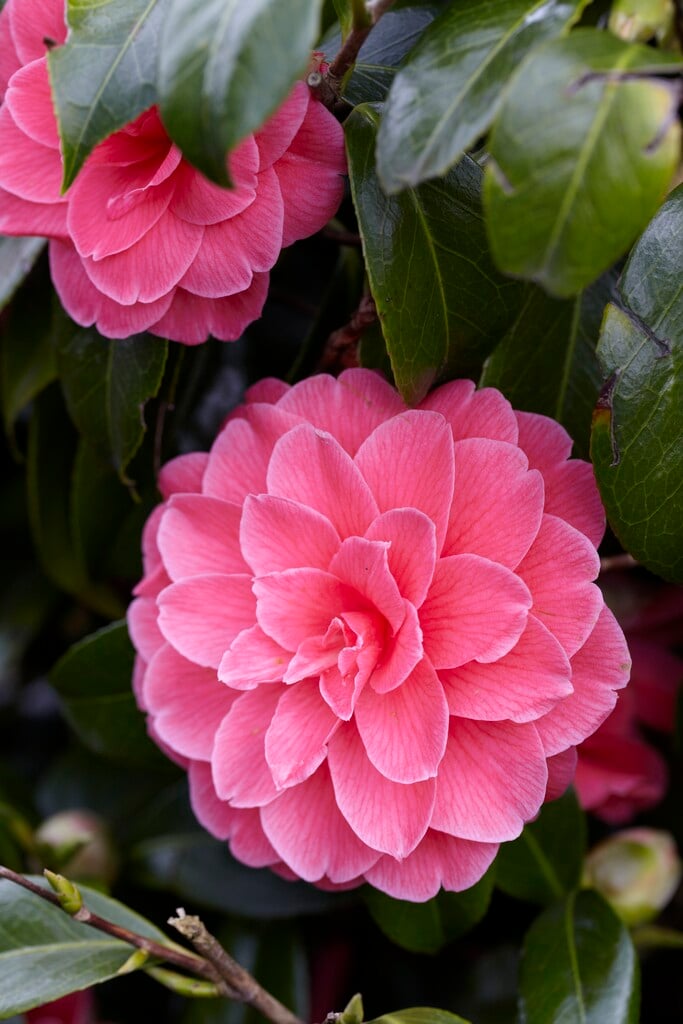 An upright evergreen shrub, with glossy green leaves with finely serrated edges. Formal double, bright pink flowers, often streaked with white down the centre of the petals, are produced in mid spring