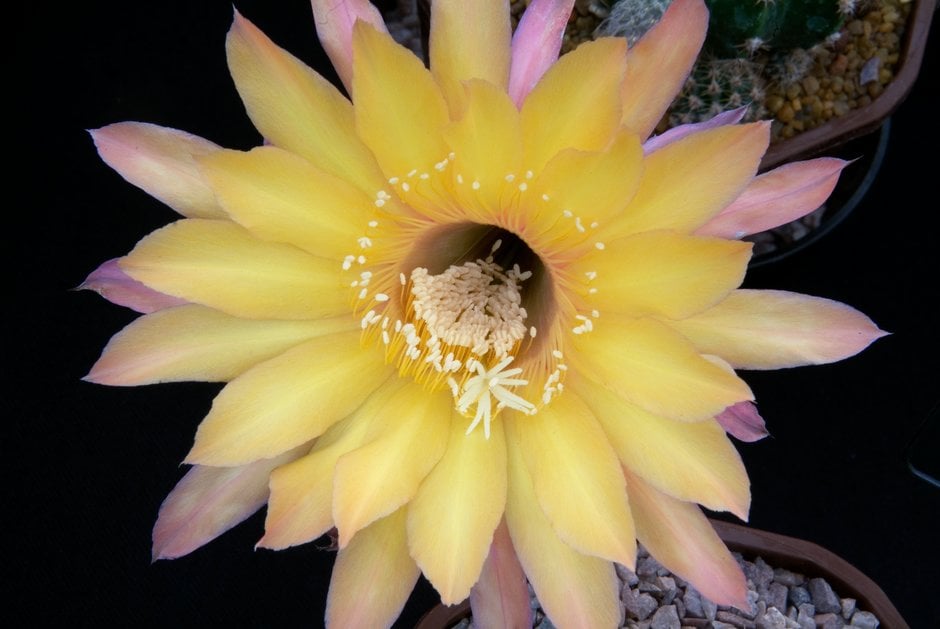 'Sunset' is a spherical to columnar cactus with a ribbed stem covered with white, radial spines. Large, trumpet-shaped to flattish yellow flowers with pink outer petals are produced in summer. Flower colour may vary between shades of yellow, pink, red and orange tints