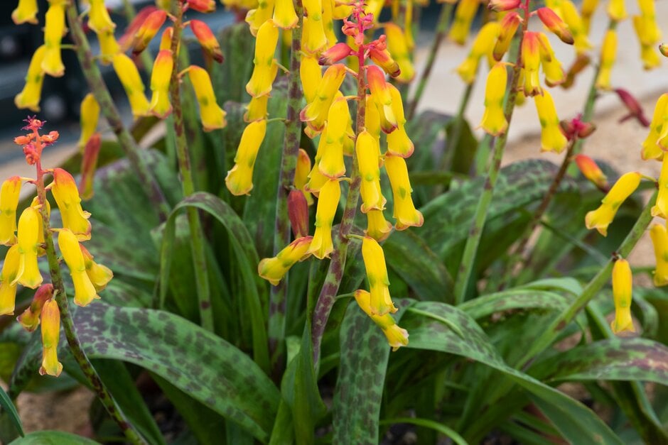 Lachenalia are bulbous perennials with strap-shaped, sometimes dark-spotted leaves, and erect stems bearing racemes or spikes of tubular flowers, slightly fragrant in some species, in autumn, winter or early spring