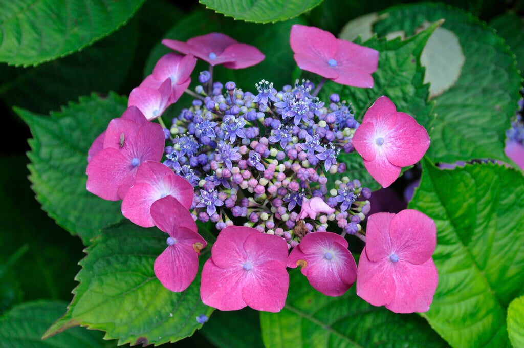 A compact, vigorous deciduous shrub to around 150cm in height, with coarsley toothed dark green foliage and a ring of bright pink lace cap flower heads around a central cluster of blue-pink florets, appearing from summer through to autumn