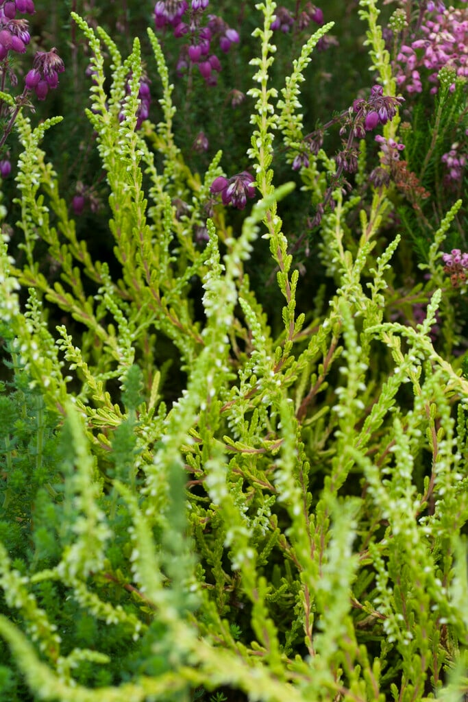 Calluna are low-growing or dwarf evergreen shrubs with stems clothed in tiny overlapping leaves, and terminal, spike-like racemes of small, 4-petalled flowers with coloured calyces