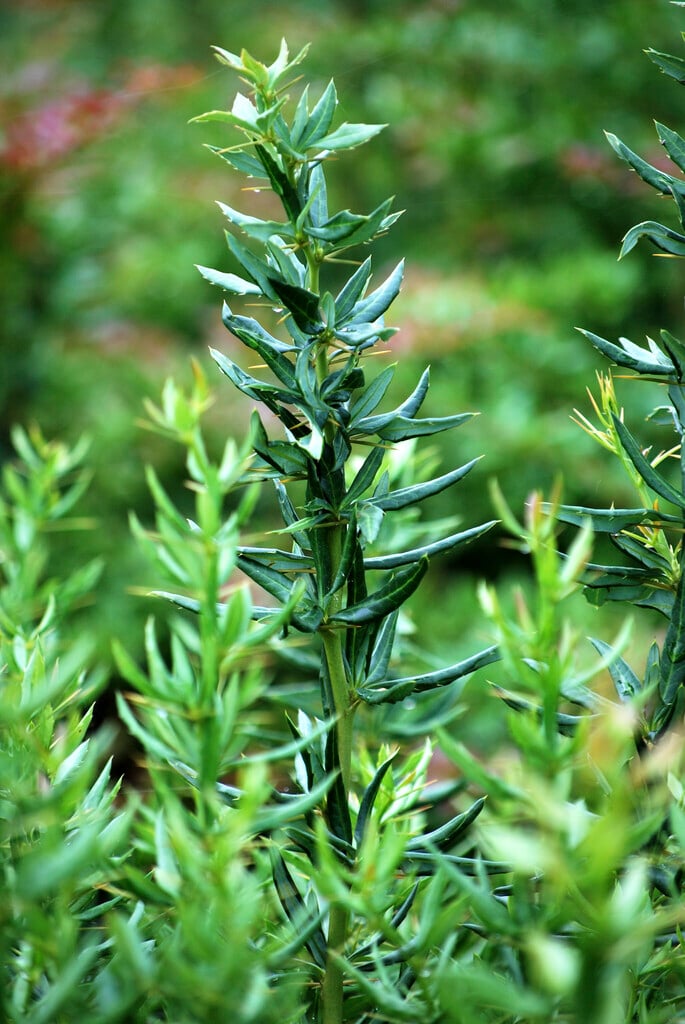 A dense, spiny evergreen shrub with a mounding habit and oval-shaped, glossy green foliage, flushed red in autumn. Clusters of drooping, golden-yellow flowers appear in spring, followed by dark purple berries in autumn