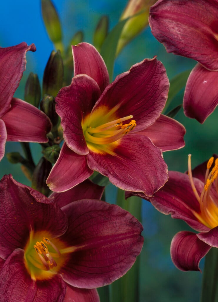 Hemerocallis may be evergreen or herbaceous perennials, with narrow, strap-shaped leaves and funnel-shaped flowers on erect stems in late spring or early summer