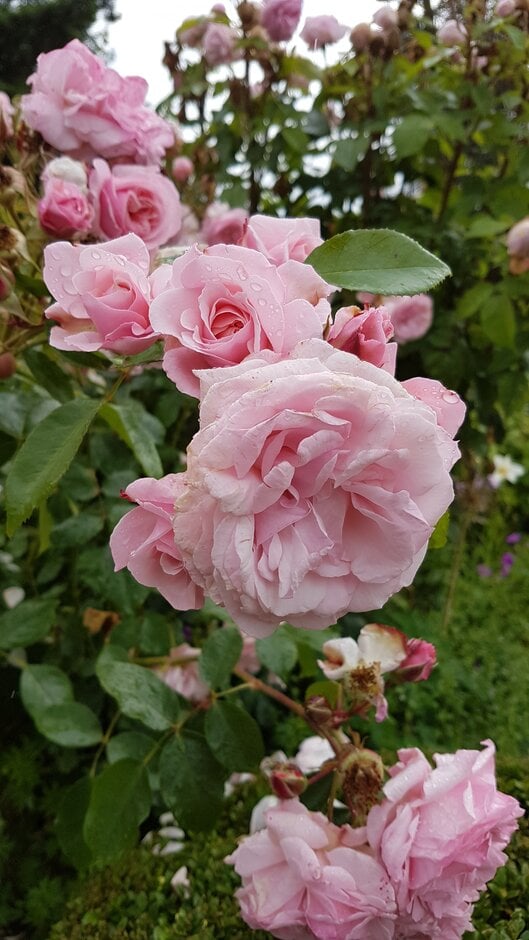 Bushy upright rose about 90cm tall and wide with healthy, semi-glossy, dark green leaves and bearing very free-flowering, large, fragrant, very full-petalled, warm pink blooms, with a flat to cupped, quartered shape, borne in small clusters, almost continuous flowering through summer to autumn