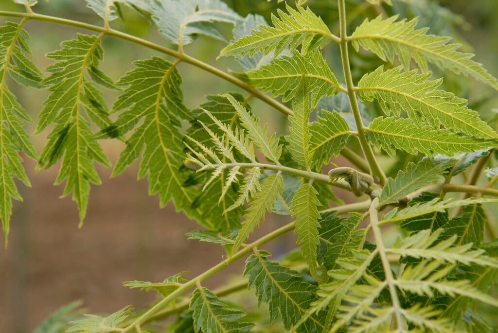 A moderately vigorous, very rare variety of walnut with a broad, cone-shaped semi-open crown, which reaches a mature height of around 15m, not very often available to purchase and grown for ornamental value as it does not produce edible fruit. It has long, deeply cut feathery bright green foliage which shimmers in the sunshine, green flowers in spring and brown to charcoal-black branches and bark