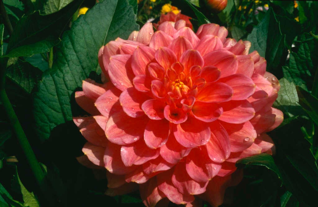 Dahlia are tuberous rooted perennials with pinnately divided leaves and showy flowerheads, double in many cultivars, in summer and autumn