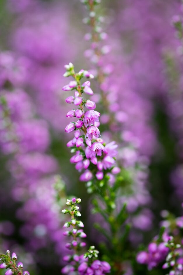 Calluna are low-growing or dwarf evergreen shrubs with stems clothed in tiny overlapping leaves, and terminal, spike-like racemes of small, 4-petalled flowers with coloured calyces