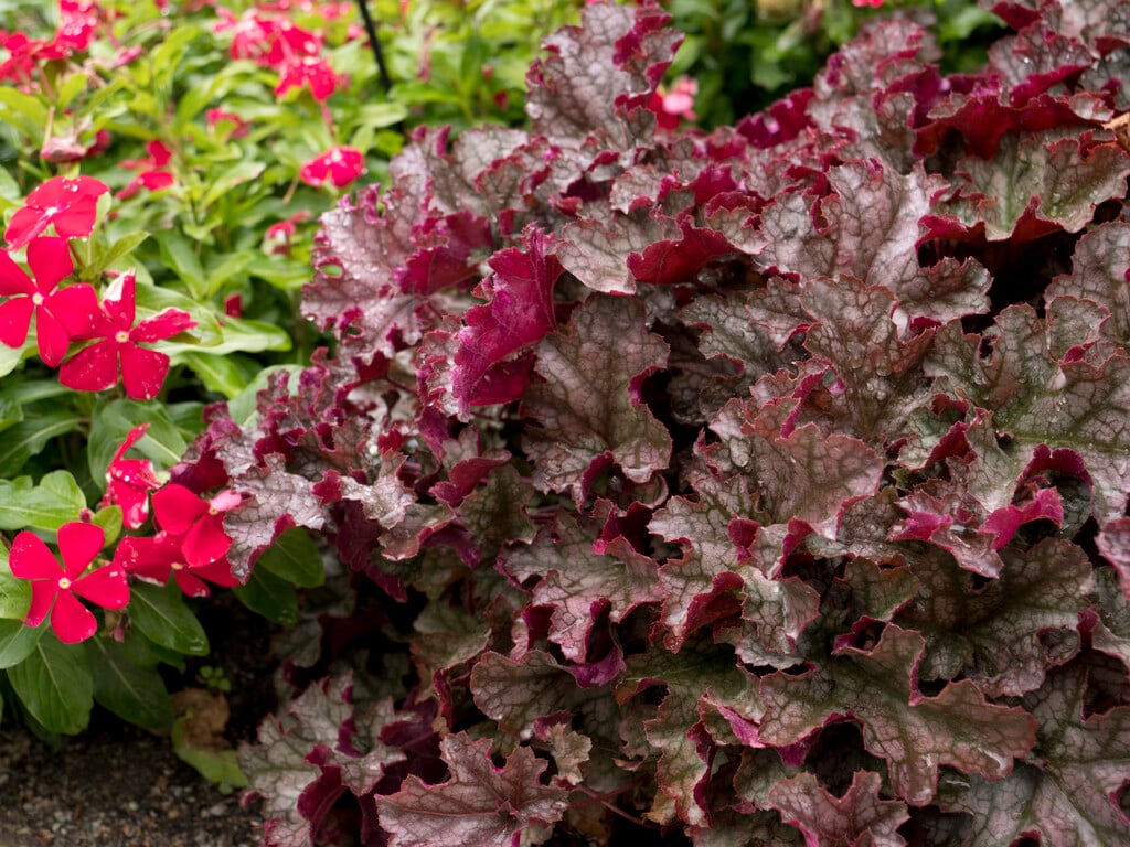 Heuchera are more or less evergreen, clump-forming perennials with attractive, rounded, shallowly palmately lobed leaves and racemes or panicles of small, tubular flowers, often with colourful calyces