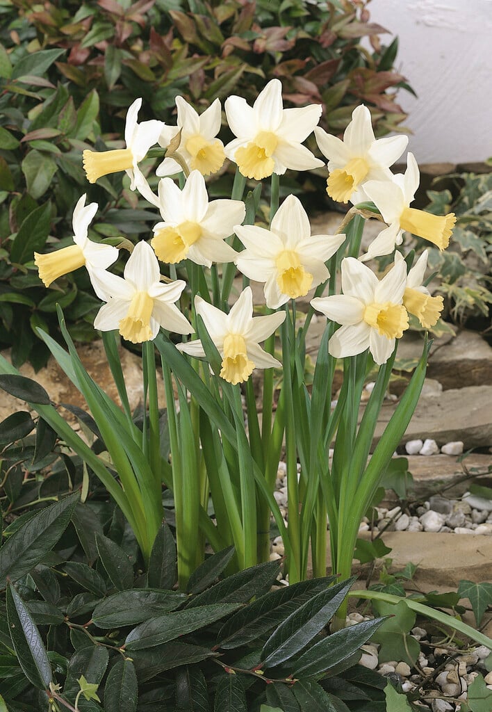 A clump-forming daffodil, to around 25cm high, with grey-green, strap-shaped leaves. Early flowering, with swept-back white petals and a long, narrow primrose yellow cup
