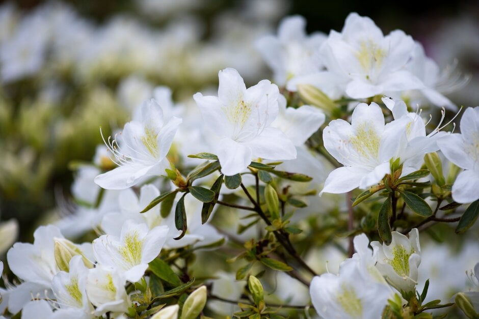 - Evergreen azaleas are compact evergreen shrubs with small leaves and terminal racemes of small, funnel-shaped, usually unscented flowers in early summer