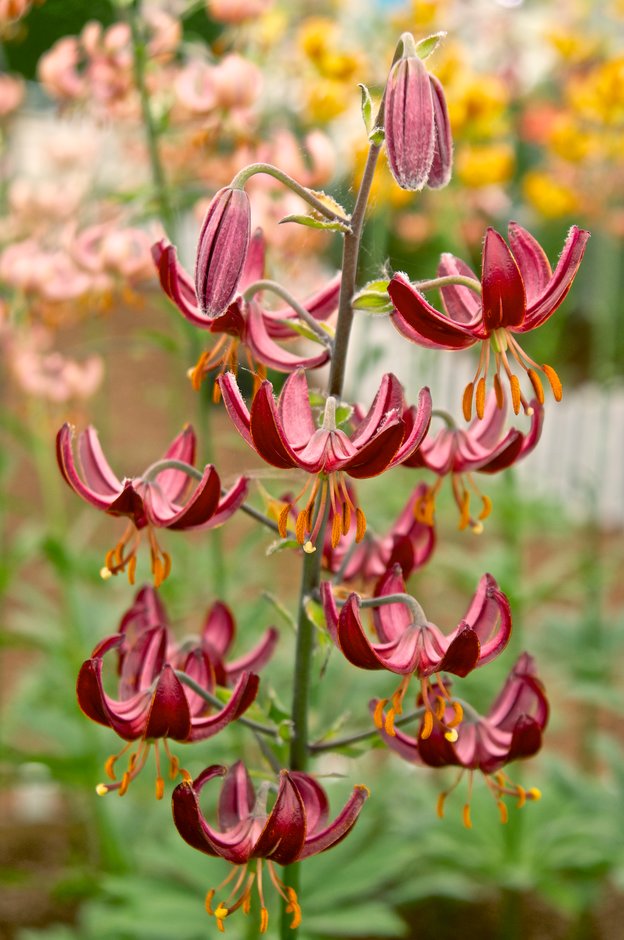 Lilium are bulbous perennials with erect stems bearing whorled or spirally arranged leaves and terminal racemes or umbels of bowl-shaped, trumpet-shaped, funnel-shaped or turks cap shaped flowers, often fragrant, and white, yellow, orange or red