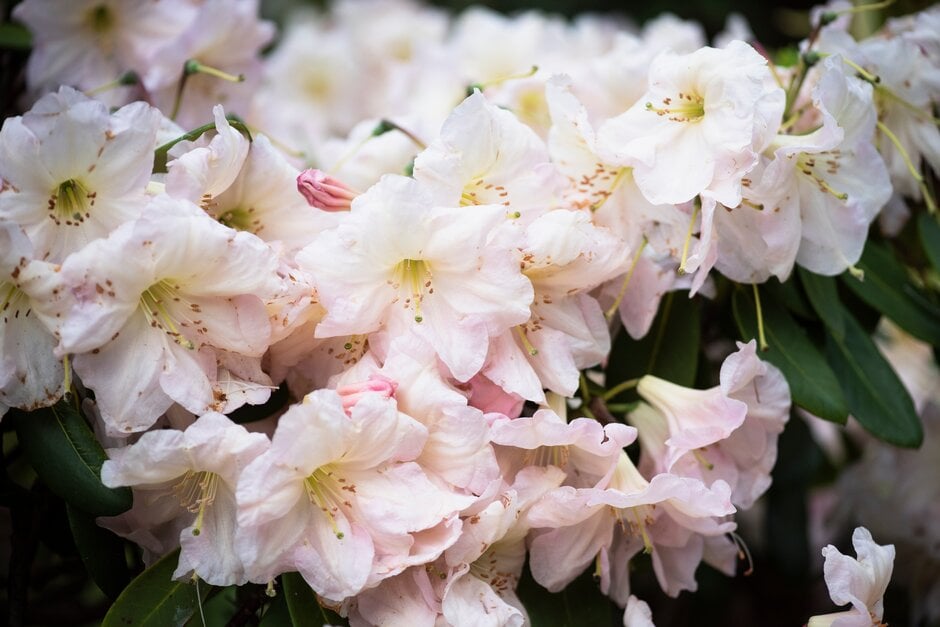 A compact, evergreen shrub with leathery green leaves and trusses of pale pink trumpet-shaped flowers which appear in the spring