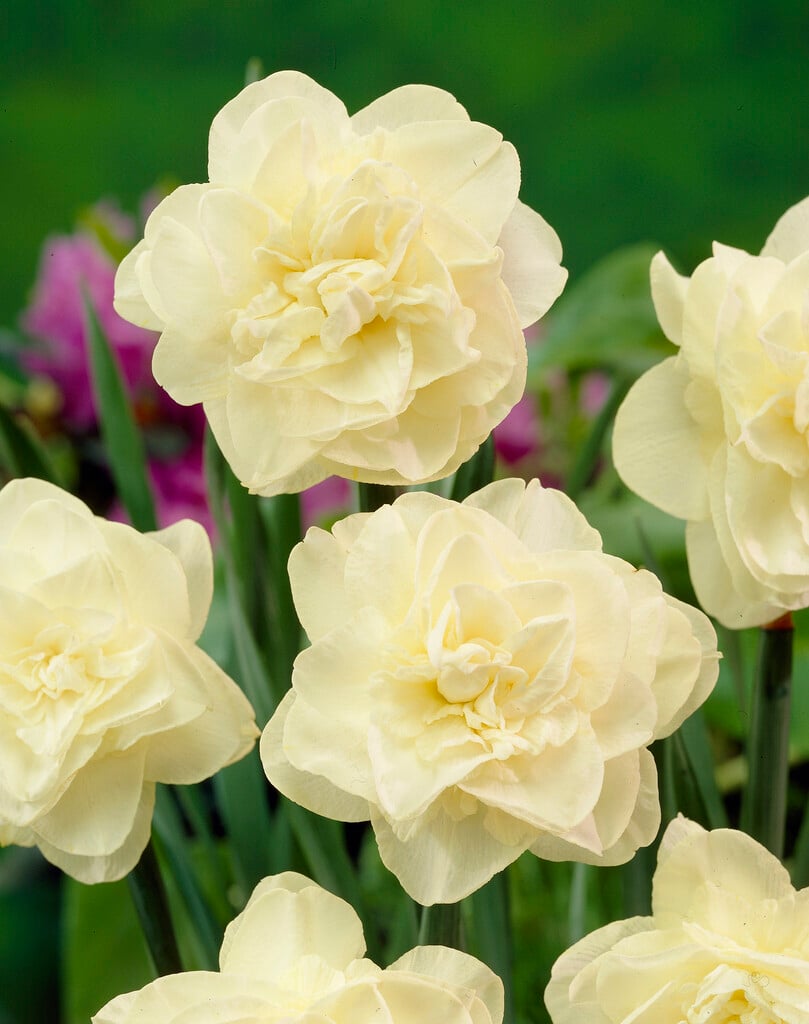 Clump-forming daffodil to 40cm high, with grey-green, strap-shaped leaves. Flowers are double, with white outer petals sometimes tinted with green, and central corona segments opening yellow and fading to white, intermixed with white petals, produced from mid to late spring
