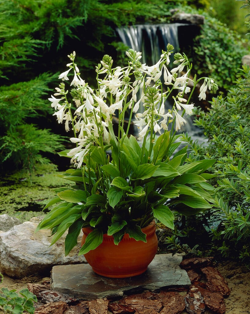 Hosta are clump-forming herbaceous perennials with simple, ovate or lance-shaped leaves, often attractively coloured or variegated, and erect racemes of nodding, funnel or bell-shaped flowers in early summer
