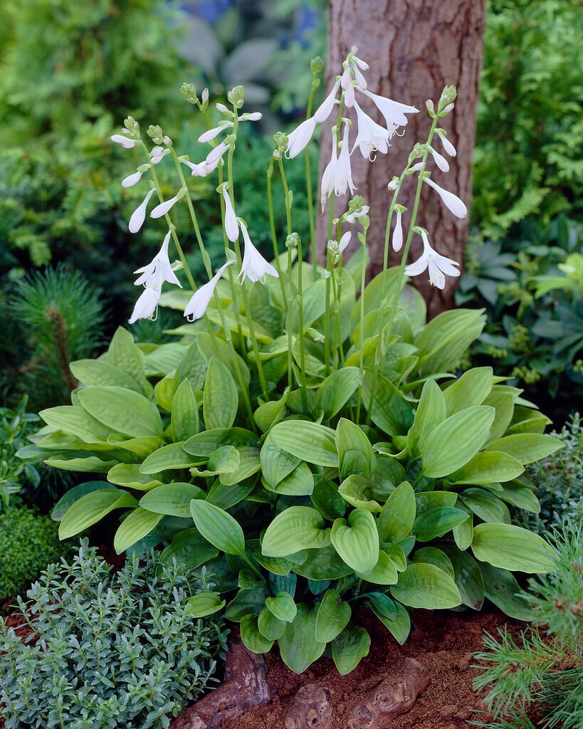 Hosta are clump-forming herbaceous perennials with simple, ovate or lance-shaped leaves, often attractively coloured or variegated, and erect racemes of nodding, funnel or bell-shaped flowers in early summer