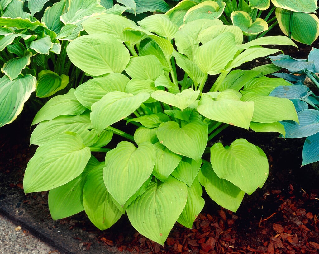 Hosta are clump-forming herbaceous perennials with simple, ovate or lance-shaped leaves, often attractively coloured or variegated, and erect racemes of nodding, funnel or bell-shaped flowers in early summer