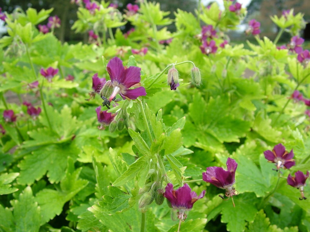 A clump-forming herbaceous perennial, about 45-50cm high, with deciduous, lobed leaves that emerge tinged with golden yellow and mature to green. Dark pink-purple flowers appear from late spring to early summer, sometimes with a second flush in late summer