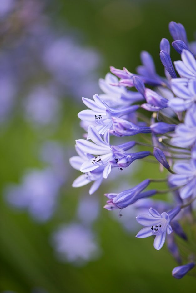Agapanthus are clump-forming perennials with narrowly strap-shaped leaves, evergreen in some species, and erect stems bearing umbels of funnel-shaped blue or white flowers