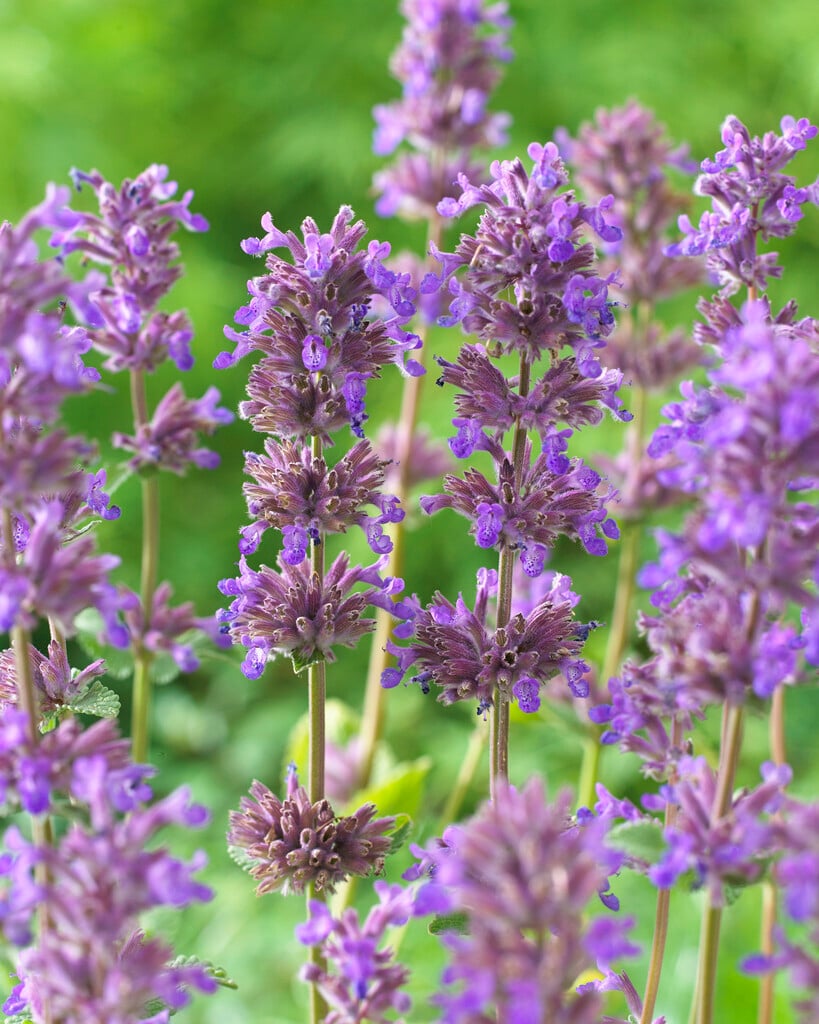 Nepeta can be annuals or, more commonly, perennials, with paired, usually aromatic leaves, and terminal spikes or panicles of 2-lipped, tubular flowers