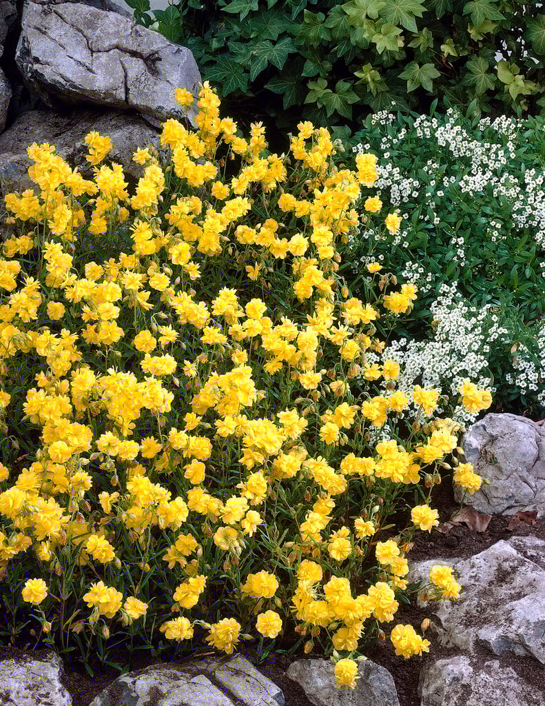 Helianthemum are bushy or spreading evergreen shrubs with small paired leaves and saucer-shaped flowers borne in short racemes in spring and early summer