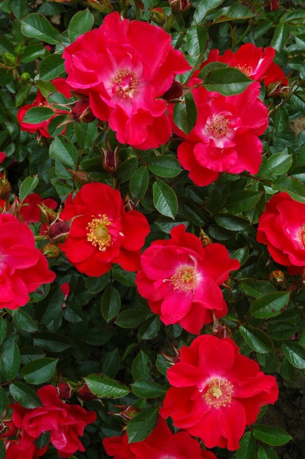Bushy rose of compact growth, about 45cm tall, with plentiful, dark green semi-glossy foliage, and bearing slightly scented, rich, ruby-red, semi-double blooms opening to display golden stamens, continuously in flower through summer to autumn