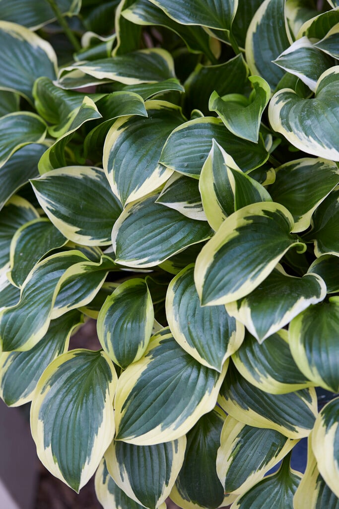 Hosta are clump-forming herbaceous perennials with simple, ovate or lance-shaped leaves, often attractively coloured or variegated, and erect racemes of nodding, funnel or bell-shaped flowers in early summer