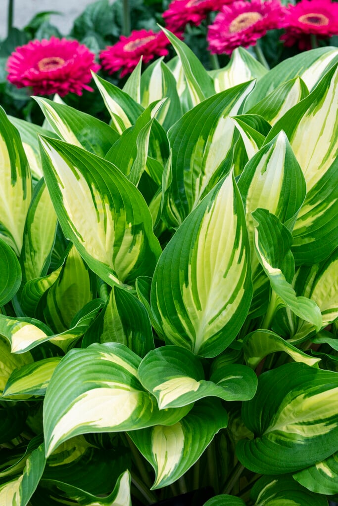 Hosta are clump-forming herbaceous perennials with simple, ovate or lance-shaped leaves, often attractively coloured or variegated, and erect racemes of nodding, funnel or bell-shaped flowers in early summer