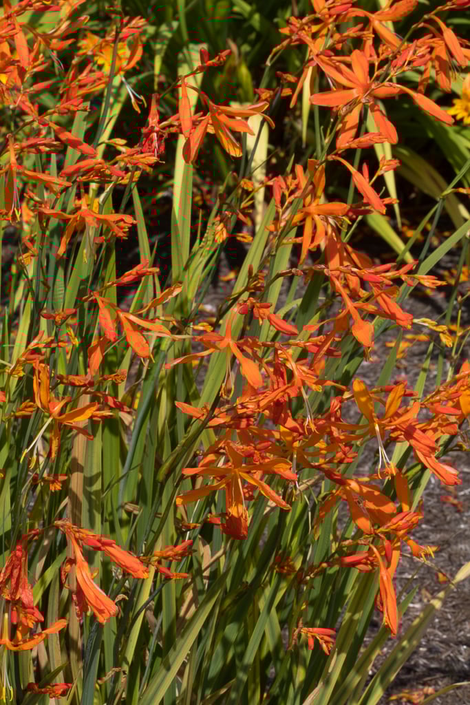 Crocosmia are deciduous cormous perennials with erect, sword-shaped leaves and branched spikes of showy, funnel-shaped flowers in summer