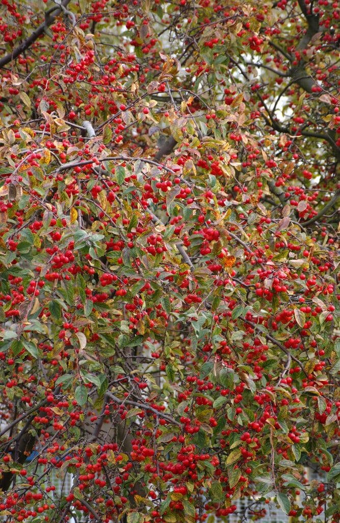 A deciduous tree, with a rounded, spreading crown and broadly oval, sometimes lobed green leaves. Fragrant white flowers open from pink buds in spring, followed in autumn by small, bright red fruits that persist into winter