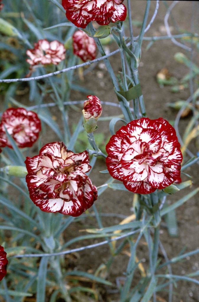 Border carnations are hardy evergreen perennials with linear leaves and erect stems bearing fully double flowers to 8cm across in mid-summer, sometimes clove-scented
