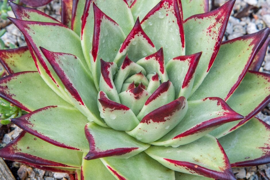 A low-growing, evergreen succulent forming a rosette to 15cm across. The pointed, fleshy leaves have very dark red markings around the tips. Red, lantern-shaped flowers are carried on slender, arching stems above the leaf rosettes in early summer
