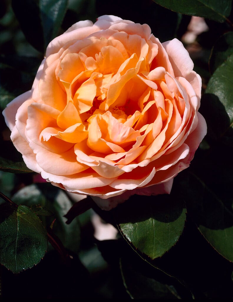 One of the shorter English roses, about 90cm in height, with rich green foliage, and bearing very fragrant, fully double apricot-peach blooms, initially rounded then opening to shallow cups, repeat-flowering from early summer onwards