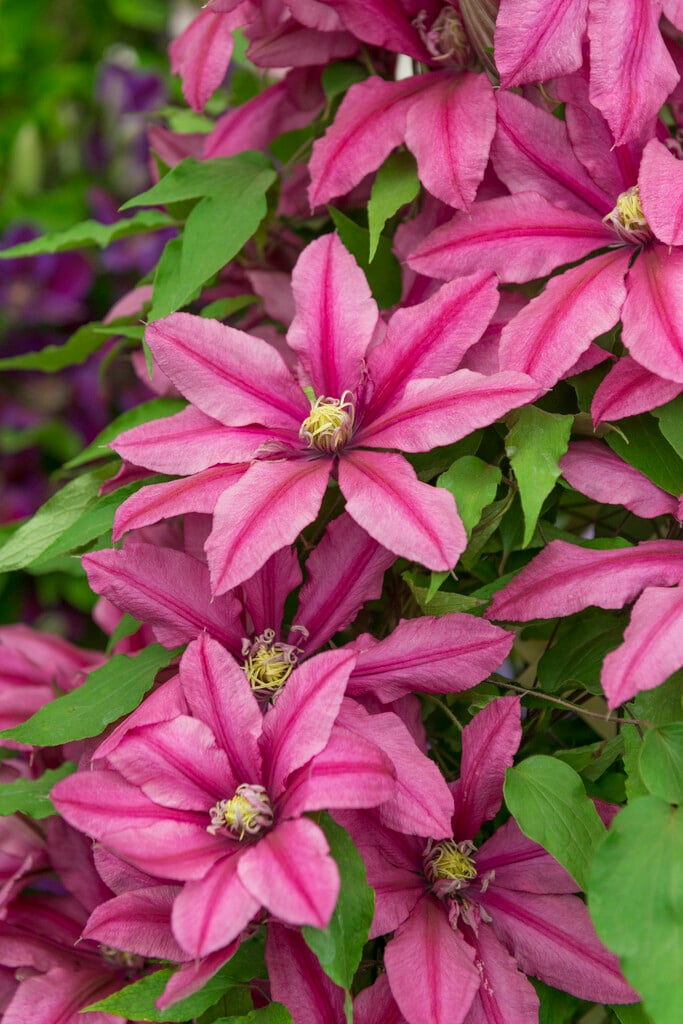 An early-flowering deciduous perennial climber with dark green leaves. Very large, cerise pink flowers with a darker cerise central stripe on the petals and golden yellow stamens appear from spring through to summer then a second flush of blooms from late summer into autumn