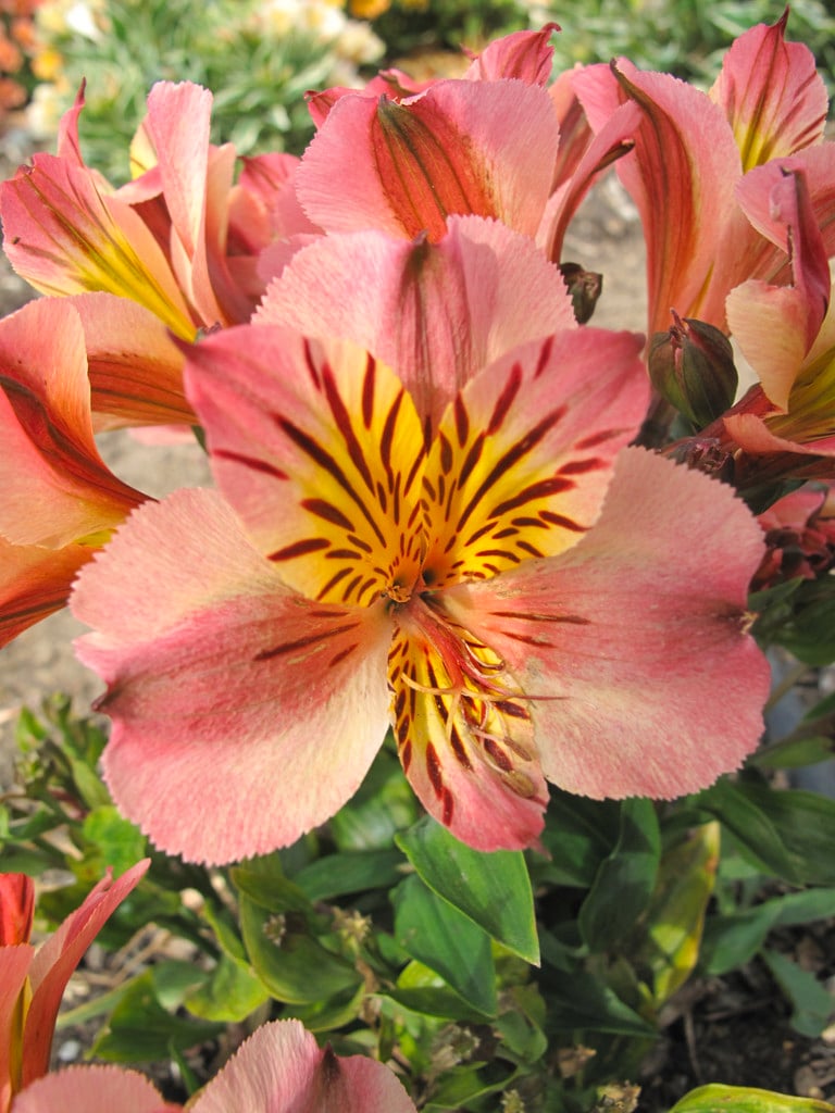 Alstroemeria are fleshy rooted herbaceous perennials forming spreading clumps of erect stems bearing narrowly lance-shaped leaves, with umbels of showy funnel-shaped flowers in summer