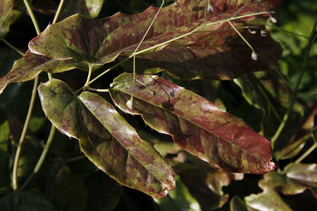 A clump-forming rhizomatous perennial 80-100cm high, with evergreen leaves divided into three long lance-shaped, glossy leaflets which are mid-green, splashed with brown when young, and have heart-shaped bases and wavy, spiny margins, and tall stems of spidery flowers of pale cream sepals suffused with light red and long-spurred, pale yellow petals suffused with orange, and dark purplish-brown mouths, from mid-spring to late spring; Epimedium leaves may be used for their nests by leaf-cutting bees