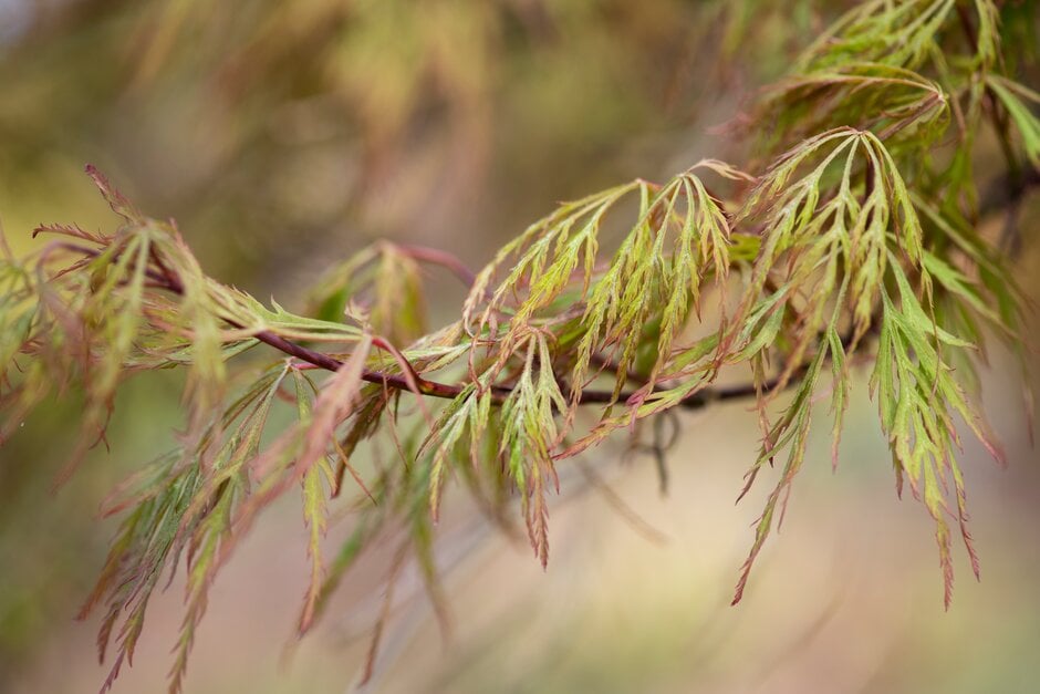 A small, deciduous tree to around 3m in height, with feathery leaves which are orange to red as they emerge in the spring, turning to pinks and greens then finally a darker orange in the autumn