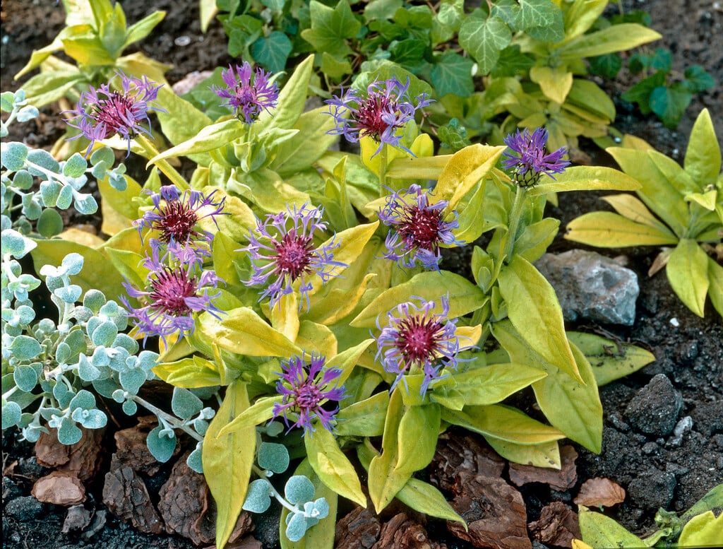 A clump-forming perennial to around 50cm high in flower, with a spreading habit and downy, bright yellow-green leaves. Flowers from late spring through the summer, with slender stems bearing buds encased in overlapping bracts, which open to large, showy flowers, with a ring of fine blue outer florets surrounding a crowd of tiny, deep reddish-purple flowers in the centre
