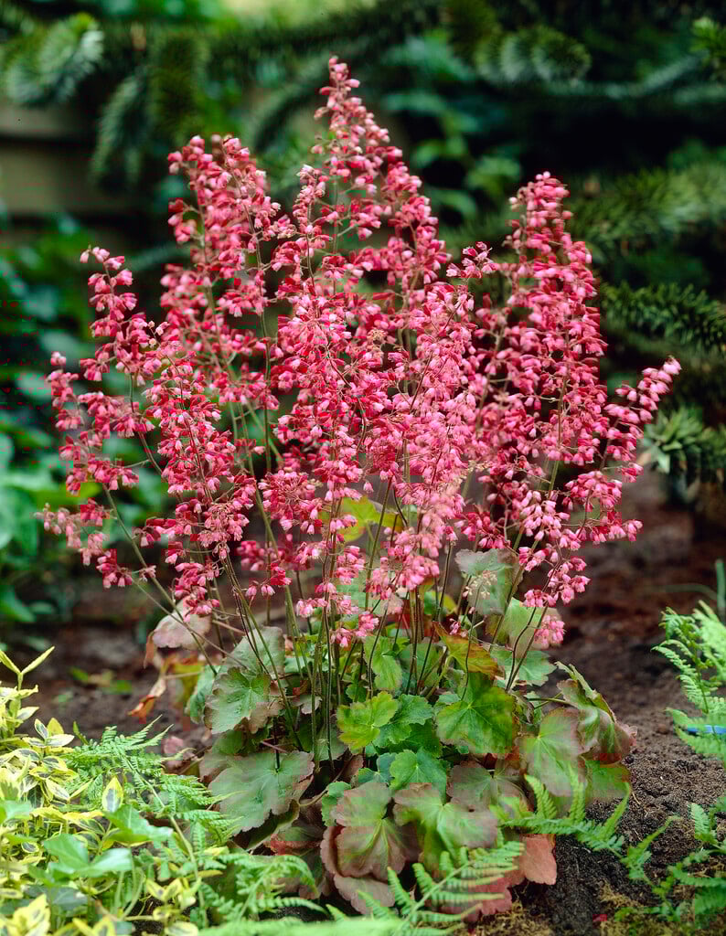 Heuchera are more or less evergreen, clump-forming perennials with attractive, rounded, shallowly palmately lobed leaves and racemes or panicles of small, tubular flowers, often with colourful calyces