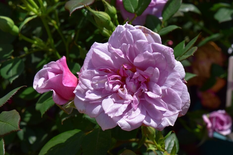 Compact, bushy rose about 45-60cm tall, with matt, dark green foliage, and producing free-flowering, very fragrant, fully double small lilac-pink rosette blooms fading to white at the edges, repeat-flowering from early summer to autumn