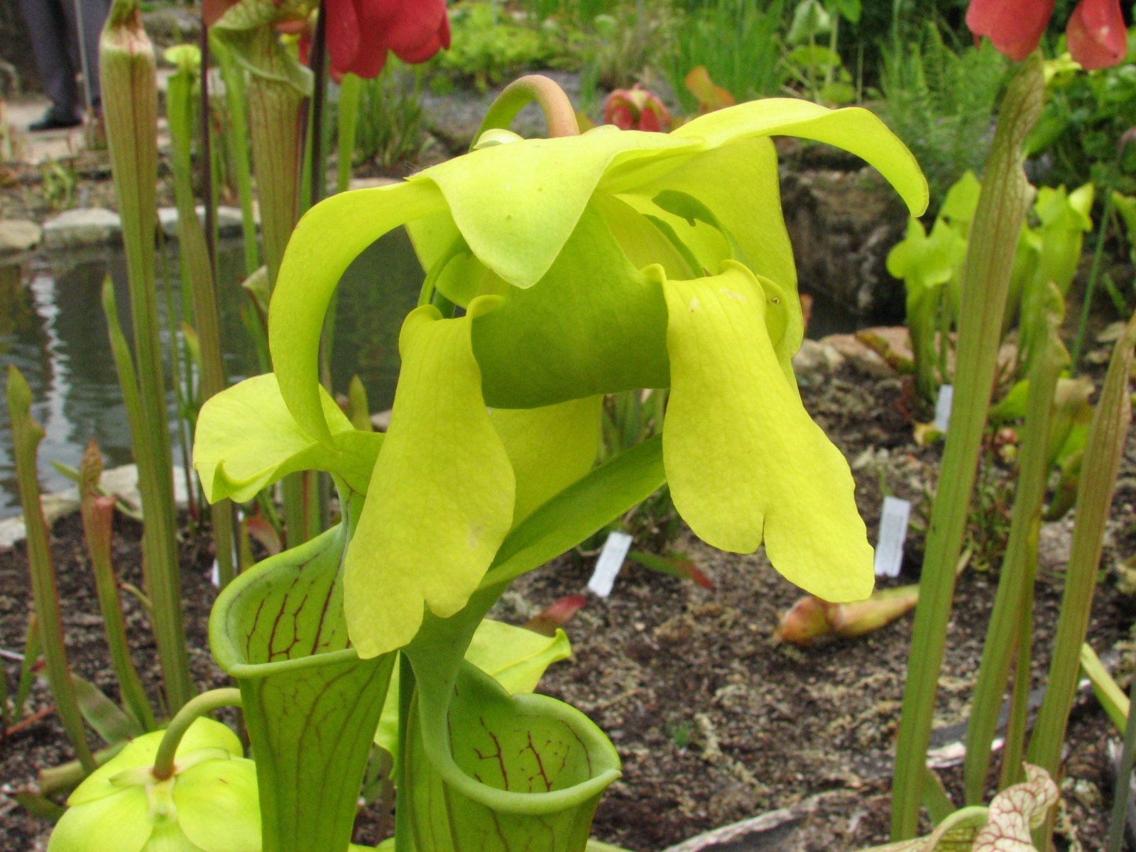 Sarracenia can be evergreen or herbaceous, rhizomatous perennials with rosettes of phyllodes mostly modified into insect-catching tubular pitchers with hooded lids, and solitary, nodding cup-shaped flowers in spring
