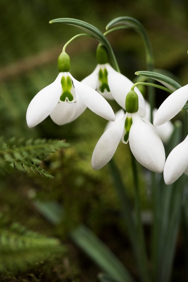 Galanthus are dwarf bulbous perennials with linear or strap-shaped leaves, and solitary, often honey-scented, nodding flowers with 3 white outer tepals and 3 smaller inner ones often marked with green