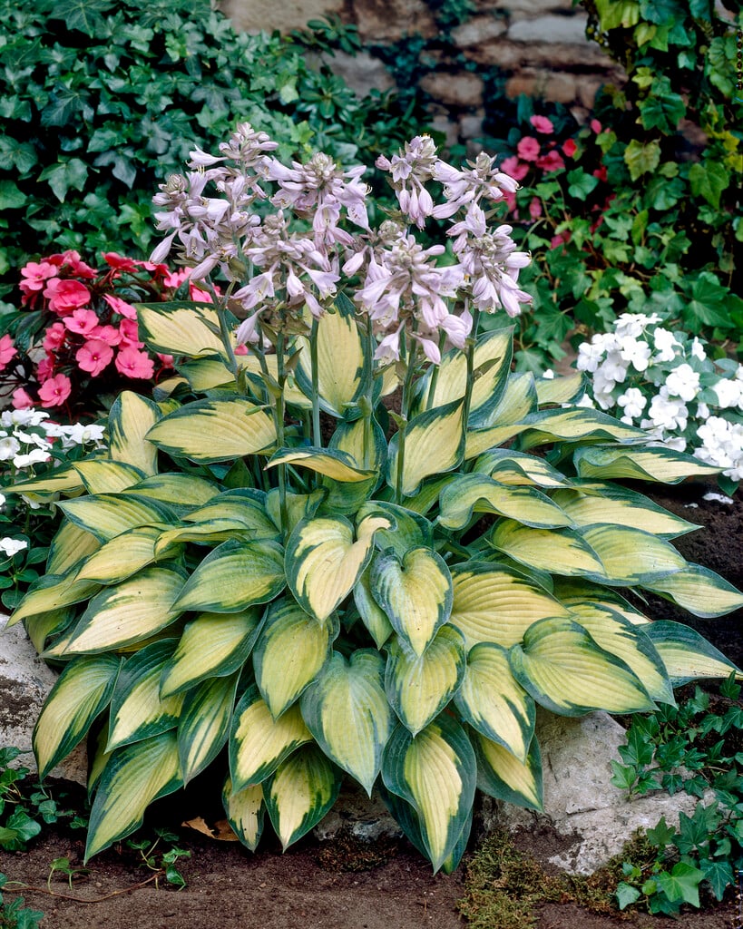 Hosta are clump-forming herbaceous perennials with simple, ovate or lance-shaped leaves, often attractively coloured or variegated, and erect racemes of nodding, funnel or bell-shaped flowers in early summer
