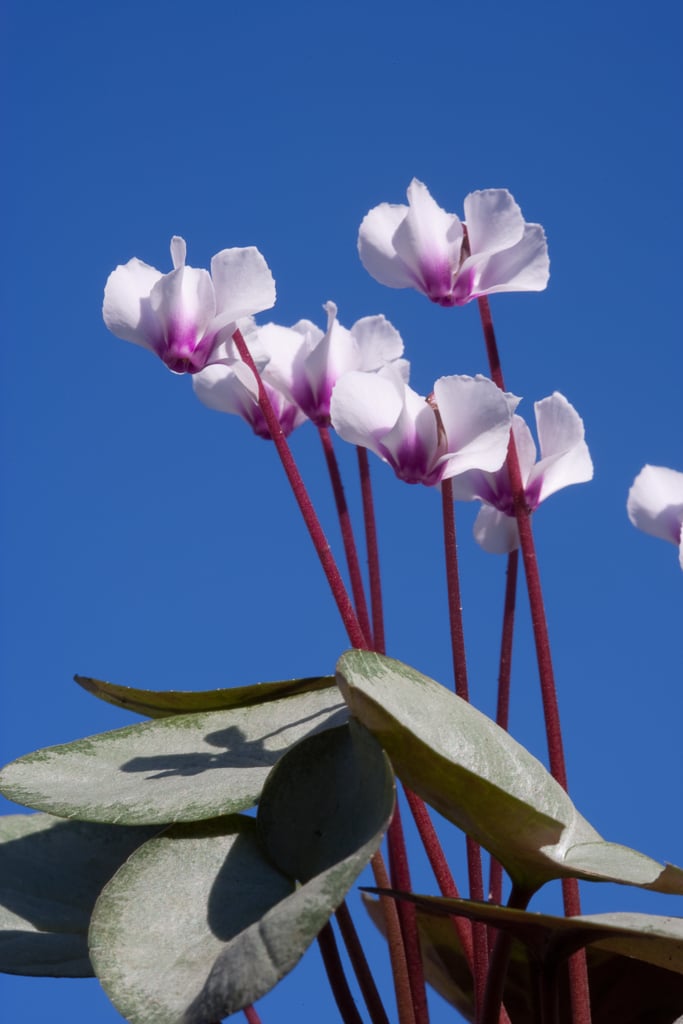 Cyclamen are tuberous perennials with rounded, sometimes angular, leaves which are often attractively mottled. The nodding, characteristically shaped flowers have 5 reflexed and twisted petals, often with dark markings at the base